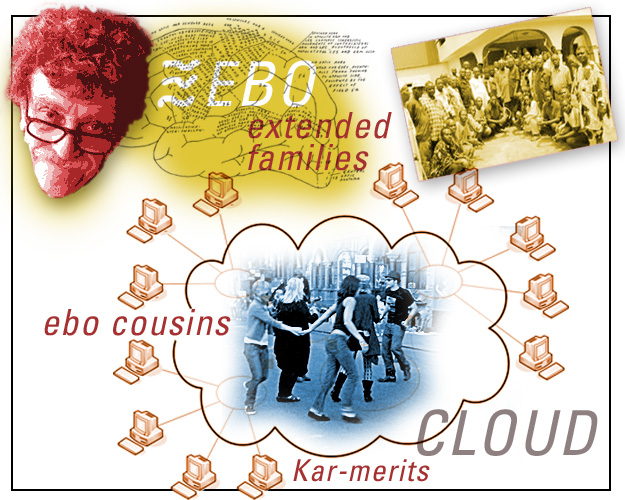 And that’s where the ebocloud.com idea originated, arguably more crackpot than the one from which it was spawned. In my novel, an ingenious billionaire internet entrepreneur—heck, they’re a dime a dozen these days—works out a fabulous algorithmic method for placing new members into appropriate extended families, or “Ebos”, based on psycho/demographic profiling. Key to the effort’s success, he and his team create a “Kar-merit” system that rewards altruistic behavior.